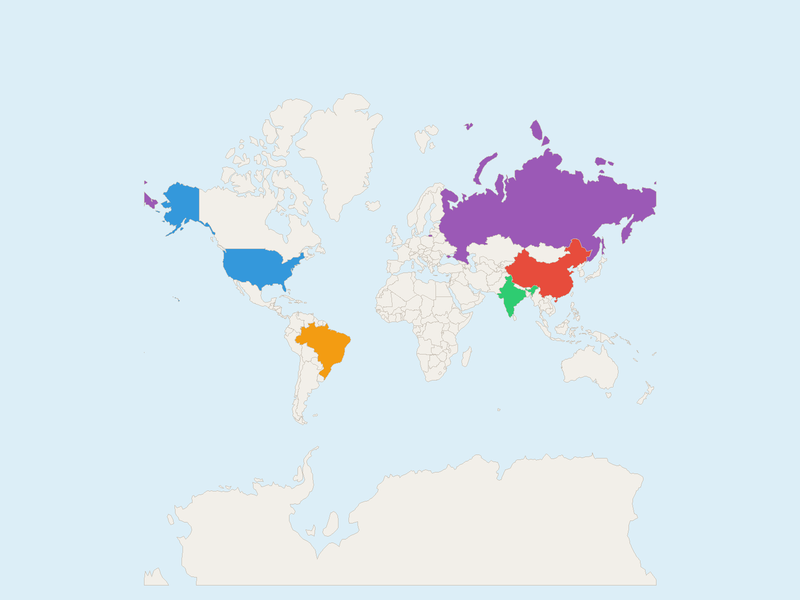 BRICS member countries each highlighted in a different color on a world map.