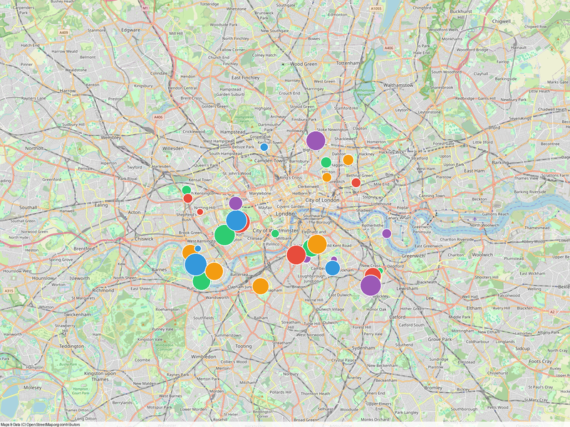Multiple data points distributed across London. Shows clustering and density patterns.